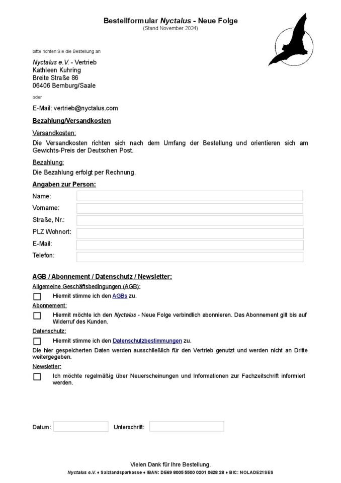 Schicken Sie bitte das ausgefüllte Bestellformular an vertrieb[at]nyctalus.com oder per Post an: